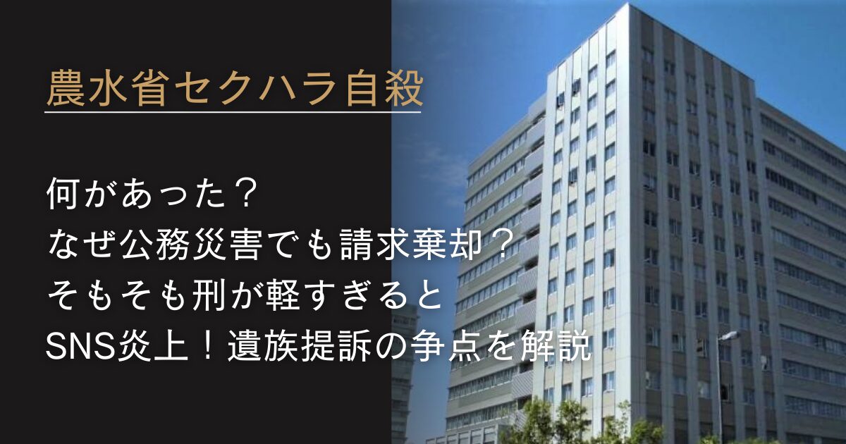 農林水産省九州農政局に勤務していた20代女性職員が、上司からのセクシャルハラスメントやパワーハラスメントにより精神的に追い詰められ、自殺したとして、遺族が国を提訴した。